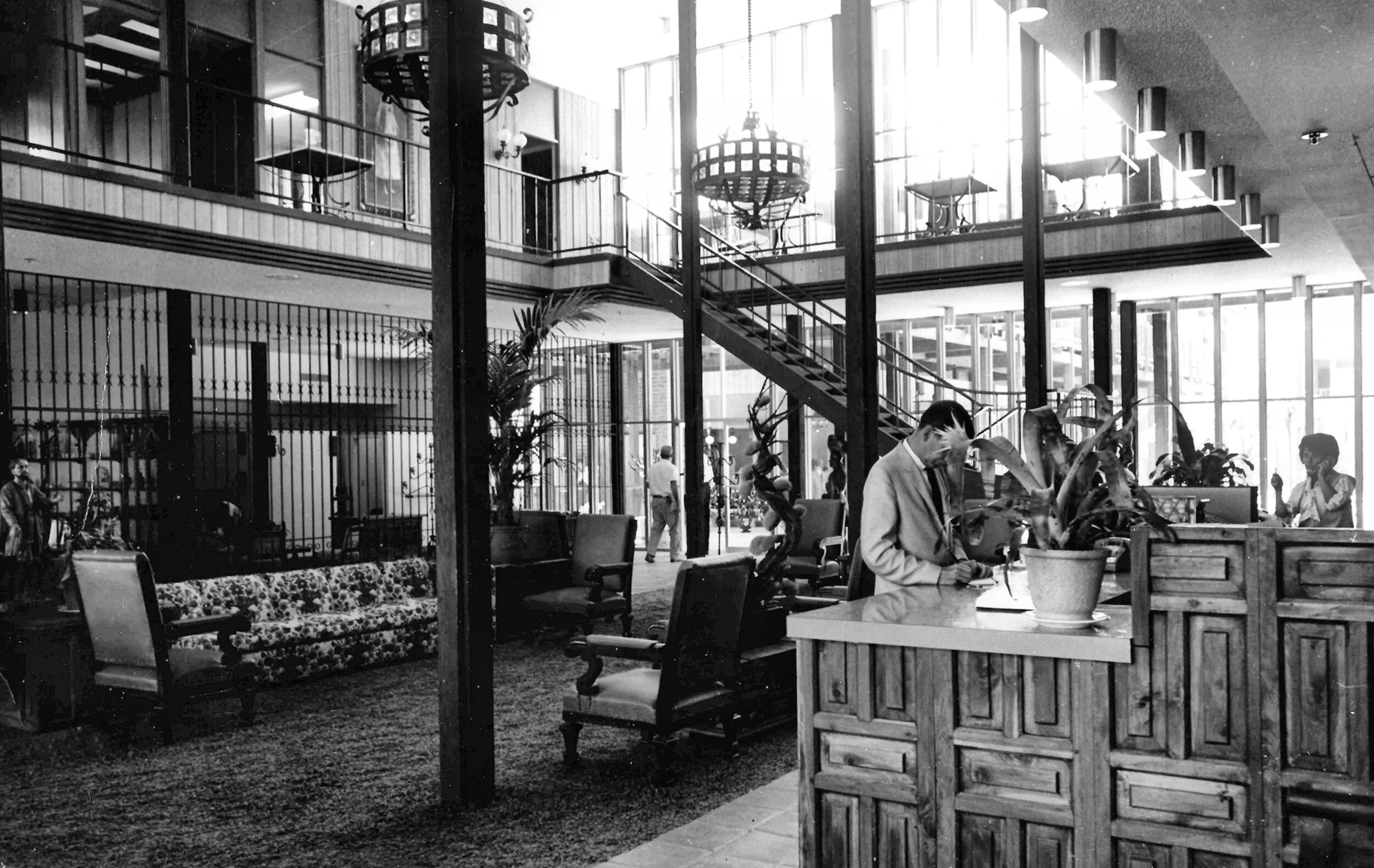 Lobby of the Saddleback Inn (circa 1964), designed by George Bissell. Located on E. 1st Street, Santa Ana, demolished in 2013 after several years of neglect.